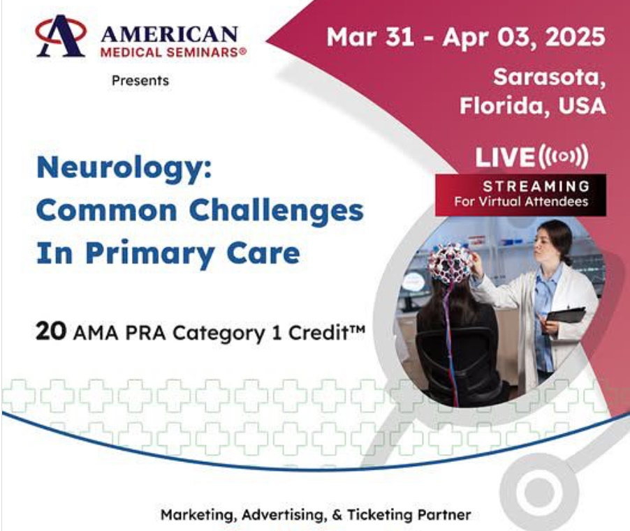 The American Medical Seminars Neurology: Common Challenges in Primary Care 2025 will be held from March 31 to April 3, 2025, at the Lido Beach Resort in Sarasota, Florida. This event is designed for healthcare professionals, focusing on neurology topics relevant to primary care. Sessions will run from 7:30 AM to 12:50 PM EST each day.